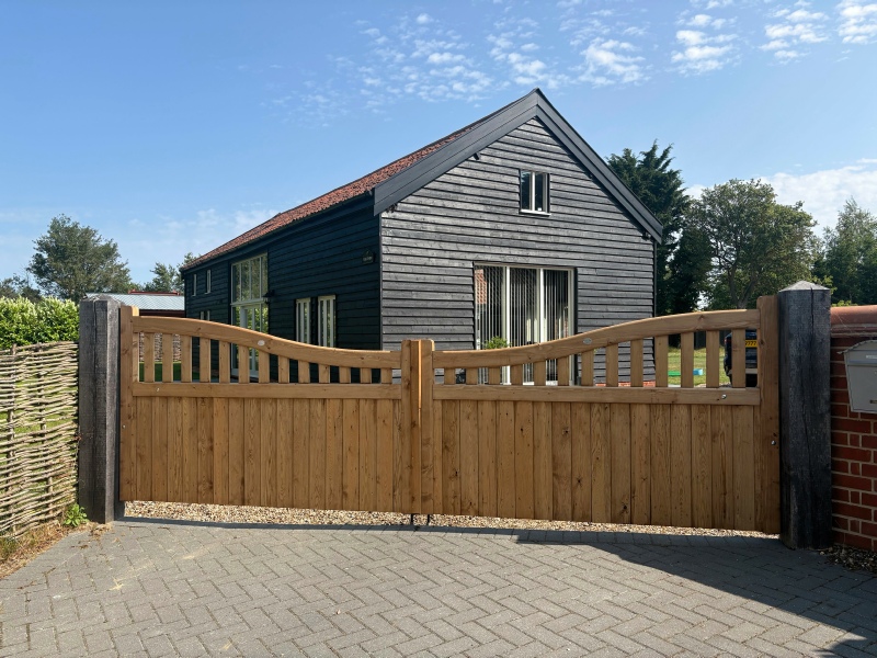 Our Knightsbridge wooden gates are extremely popular. They are both elegant and practical and suit virtually any entrance or driveway. The curved beam is the same as our flagship Ryes Driveway gates and rises 240mm (9.5”) from the hinge end to the centre. The gate ‘ears’ are also the same half rounded feature as the Ryes wooden driveway gates, which compliments the curve. The slats are 20 x 70mm and are spaced to an aesthetically pleasing result. Overall it’s an excellent gate with plenty to offer its owners in terms of looks and functionality. These gates are available as hardwood gates of softwood gates. Please note all of our clad gates have stainless steel nails visible on the face of the gate.
