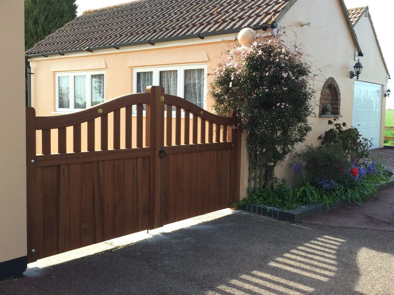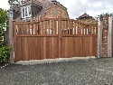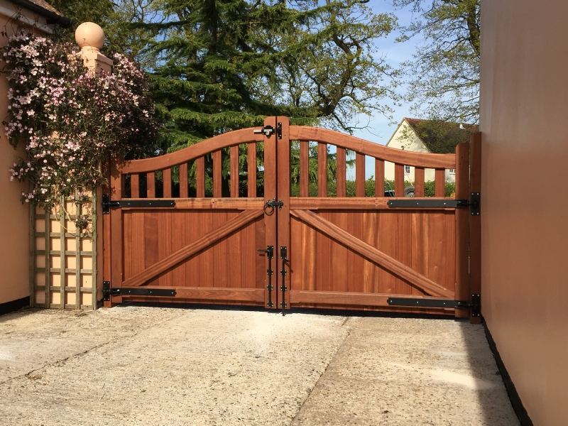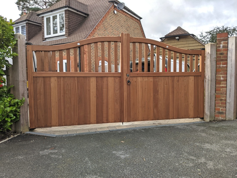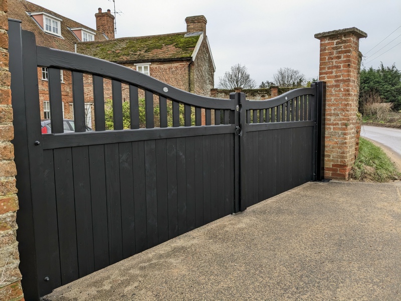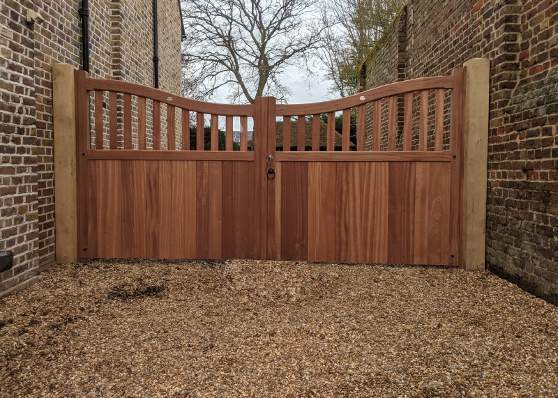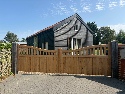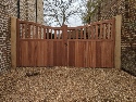 Our Knightsbridge wooden gates are extremely popular. They are both elegant and practical and suit virtually any entrance or driveway. The curved beam is the same as our flagship Ryes Driveway gates and rises 240mm (9.5”) from the hinge end to the centre. The gate ‘ears’ are also the same half rounded feature as the Ryes wooden driveway gates, which compliments the curve. The slats are 20 x 70mm and are spaced to an aesthetically pleasing result. Overall it’s an excellent gate with plenty to offer its owners in terms of looks and functionality. These gates are available as hardwood gates of softwood gates. Please note all of our clad gates have stainless steel nails visible on the face of the gate.