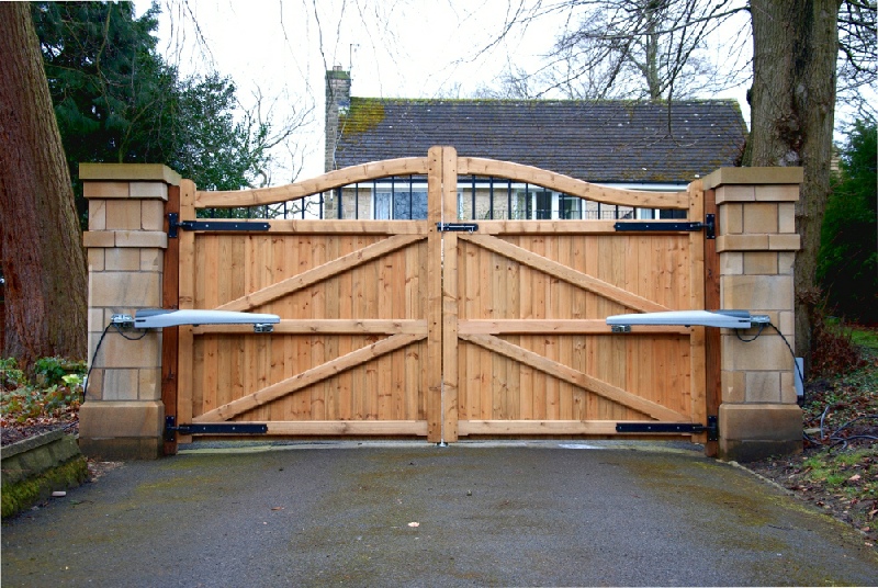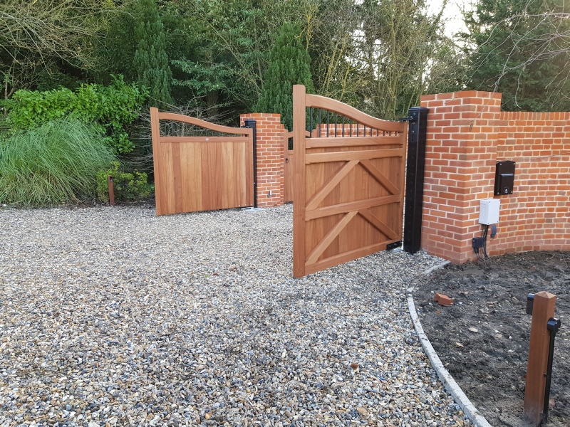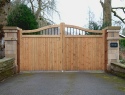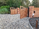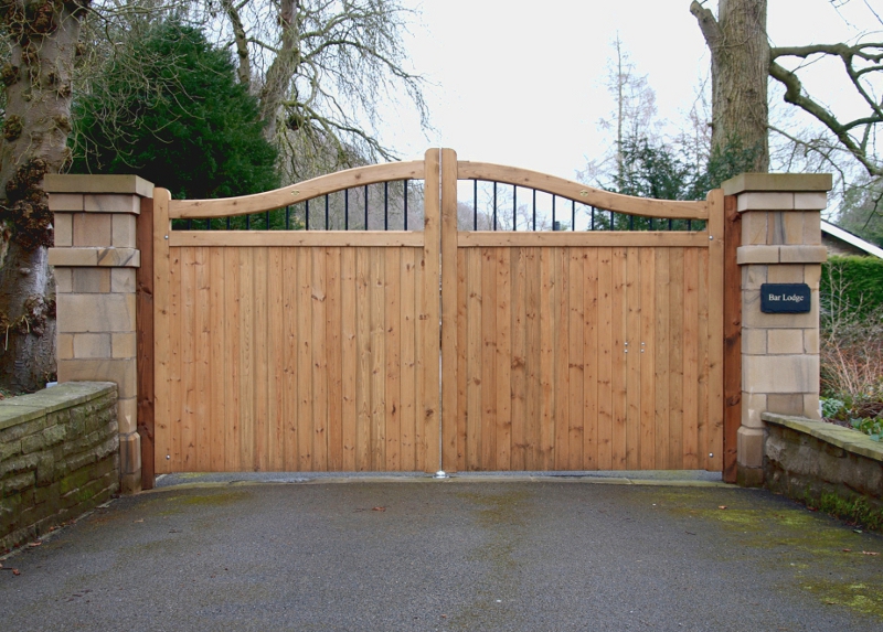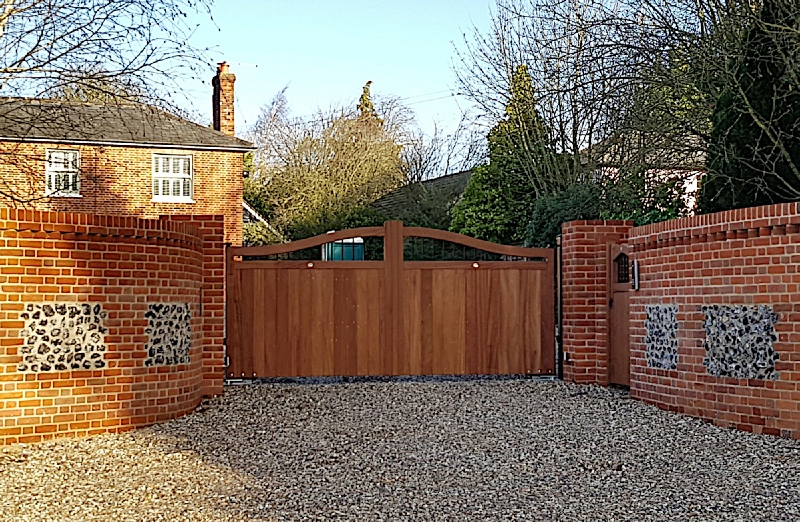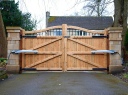 The Priory gates are a relatively new addition to our wooden gates range and has become popular already. It is essentially the same as the Essex Gates but without the spike-heads on top and shortened ‘ears’. It has a slightly less imposing appearance too. The bars are 16mm steel, coated in black five times for longevity. The curved top beam is the same as all our other ‘swan-neck’ gates and rises 240mm (9.5”). It’s joints are mortise and tenon with strong hardwood dowels securing them in place. The design favours openings where some privacy is required but not total obscurity. Please note all of our clad gates have stainless steel nails visible on the face of the gate.
