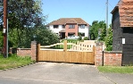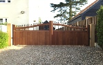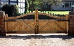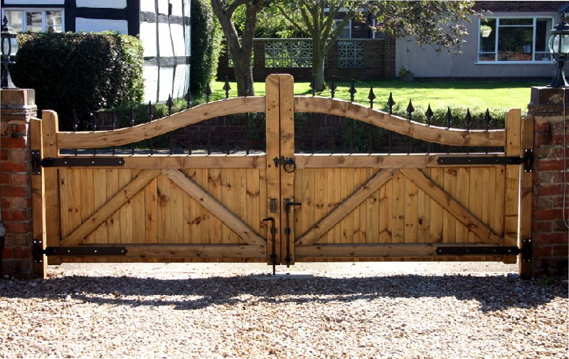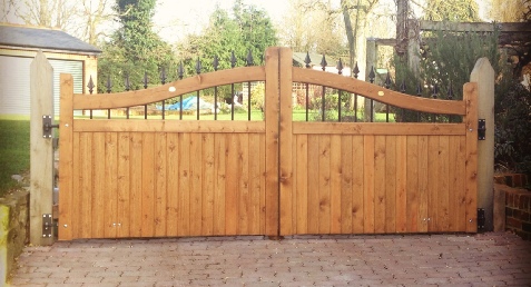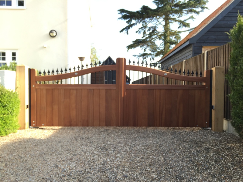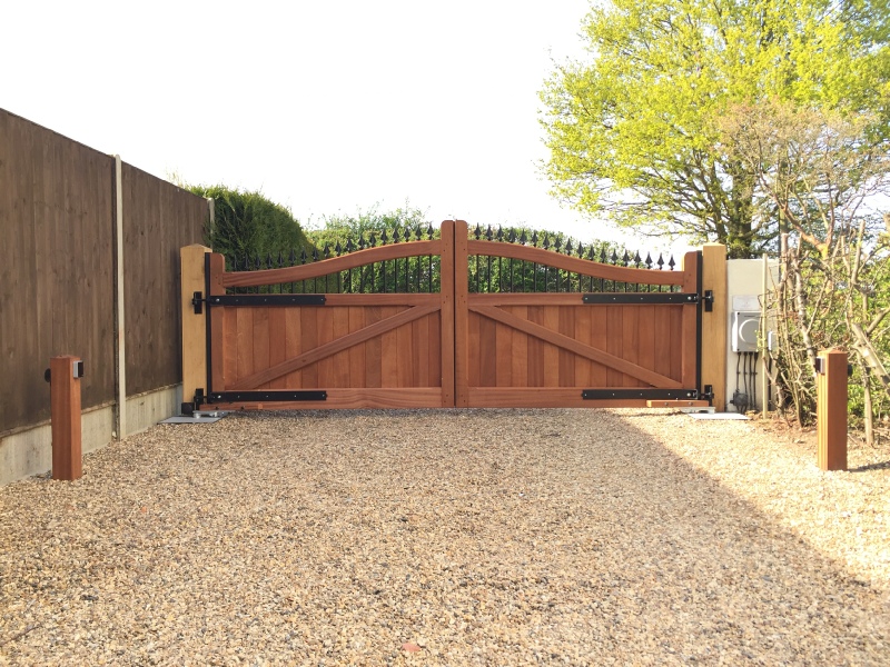 The Sherwood wooden driveway gates are the little brother of the mighty Camelot Entrance Gates. It’s essentially the same gate, only shorter. Highly suited to driveways with low walls or fences, the Sherwood certainly makes an impressive statement and greets your visitors without the cold look and feel of purely metal gates. The arrow-head bars are made from 16mm solid steel and coated in black five times. As with all our quality wooden driveway gates, mortise and tenon joints feature throughout the heavy duty frame. These wooden gates suit gate automation.