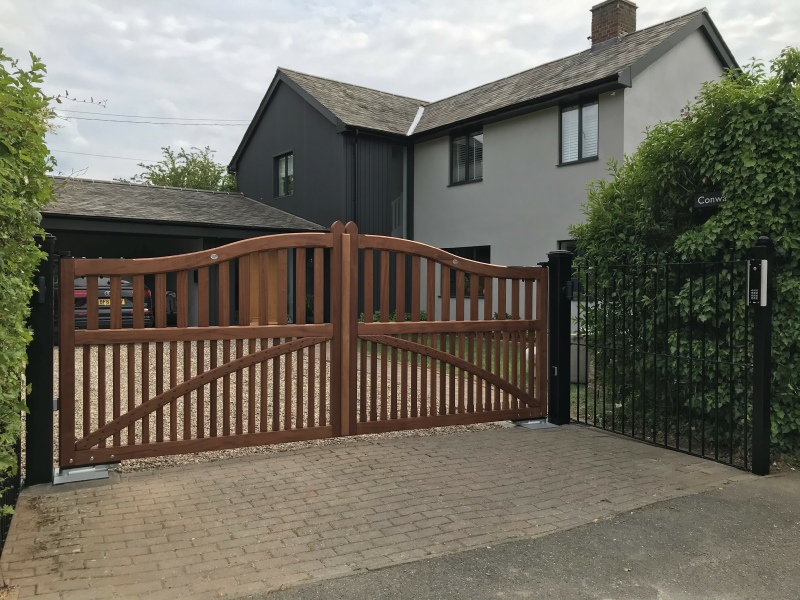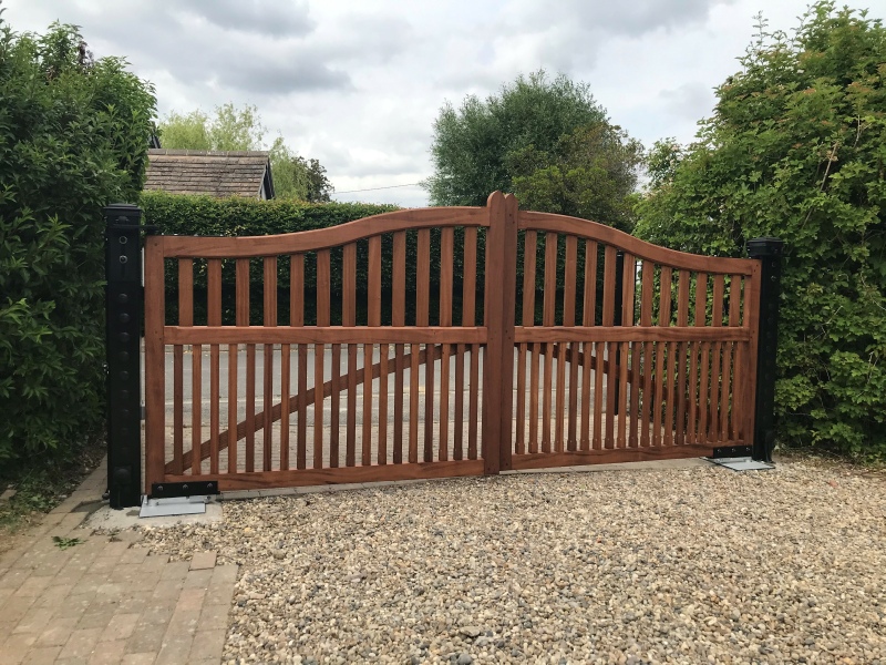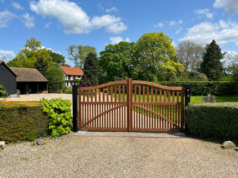 Our London wooden gates are extremely popular. They are both elegant and practical and suit virtually any entrance or driveway. The curved beam is the same as our flagship Ryes Driveway gates and rises 240mm (9.5”) from the hinge end to the centre. The gate ‘ears’ are also the same half rounded feature as the Ryes wooden driveway gates, which compliments the curve. The slats are 20 x 70mm and are spaced to an aesthetically pleasing result. Overall it’s an excellent gate with plenty to offer its owners in terms of looks and functionality. These gates are available as hardwood gates of softwood gates. Please note these gates have black hand finished clout nails fixing the curved diagonal brace that will rust and add to the character of this gate over time.
